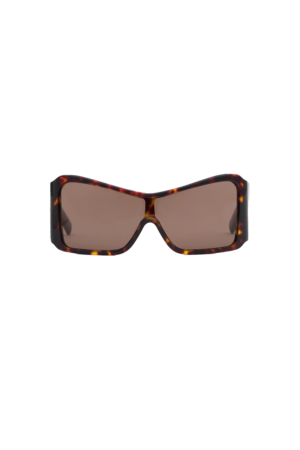The Vaquera Unisex Shield Sunglasses handmade in acetate featuring a sleek oversized silhouette, integrated nose pads, and large inset logo hardware at the temples. 5.75" x 2.25" DETAILS - Handcrafted - Shield silhouette - Integrated nose pads - Inset logo hardware at temples - Gold-tone hardware - Includes case - Size: 137. 142 Material: Acetate Made in Japan Product codes: - SKU: ESSX/VAQ/SS25/VAQ09K100/Brown/OS - UPC: 3607936334925