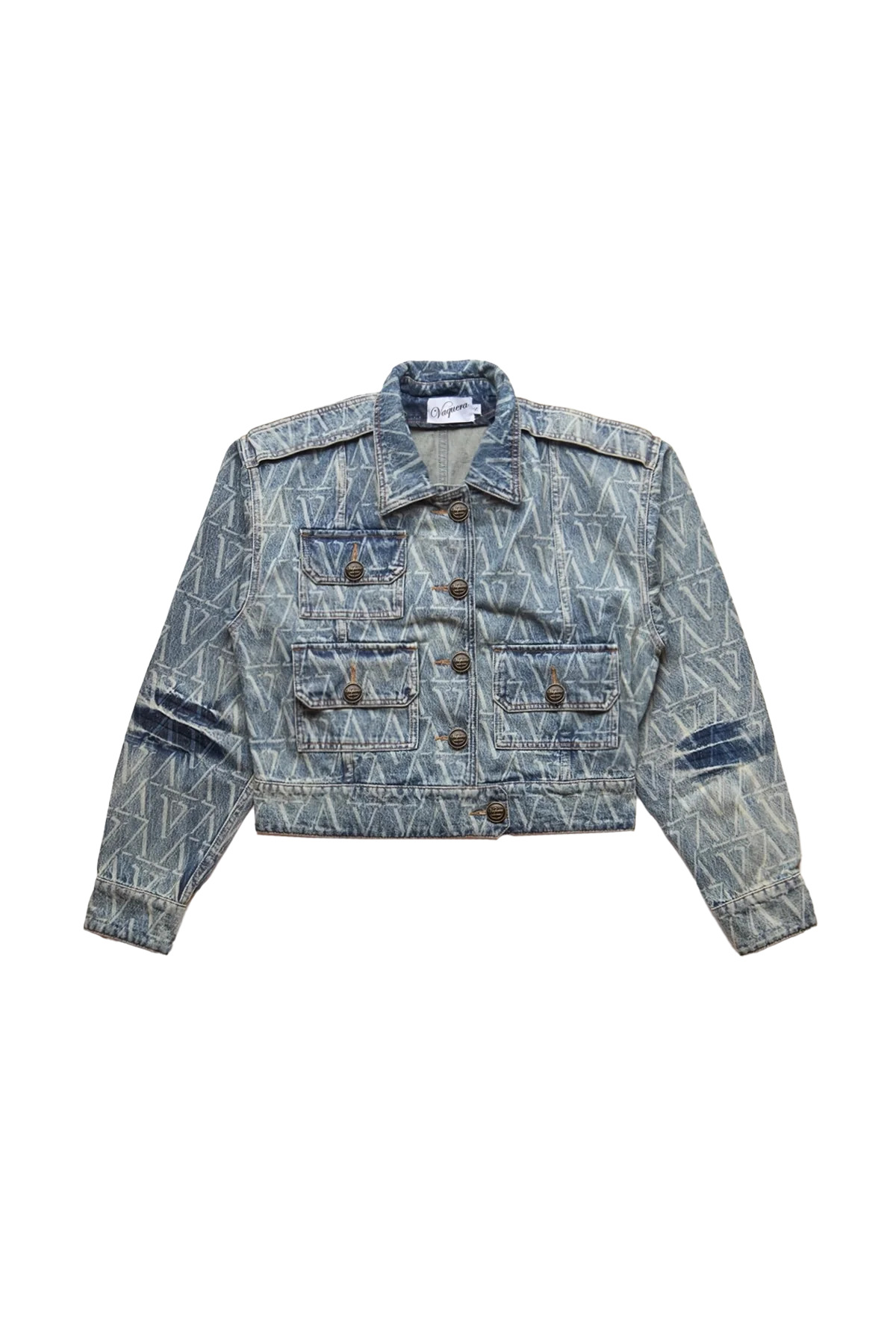 The Vaquera Denim Jacket in faded blue woven cotton is a structured, midweight jacket featuring an all-over jacqaurd logo print, three front buttoned flap pockets, and epaulettes. Unlined. DETAILS - Midweight woven denim - Soft handfeel - Classic spread collar - Logo-engraved hardware - Button front closure - Buttoned flap chest pockets - Adjustable button cuffs + side waist tabs - Straight hemline with reinforced stitching Sizing: - True to size Material: Cotton Made in Tunisia Product codes: - SKU: ESSX/VAQ/SS25/VAQ09J003/Blue/S - UPC: 3607936333089
