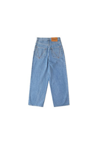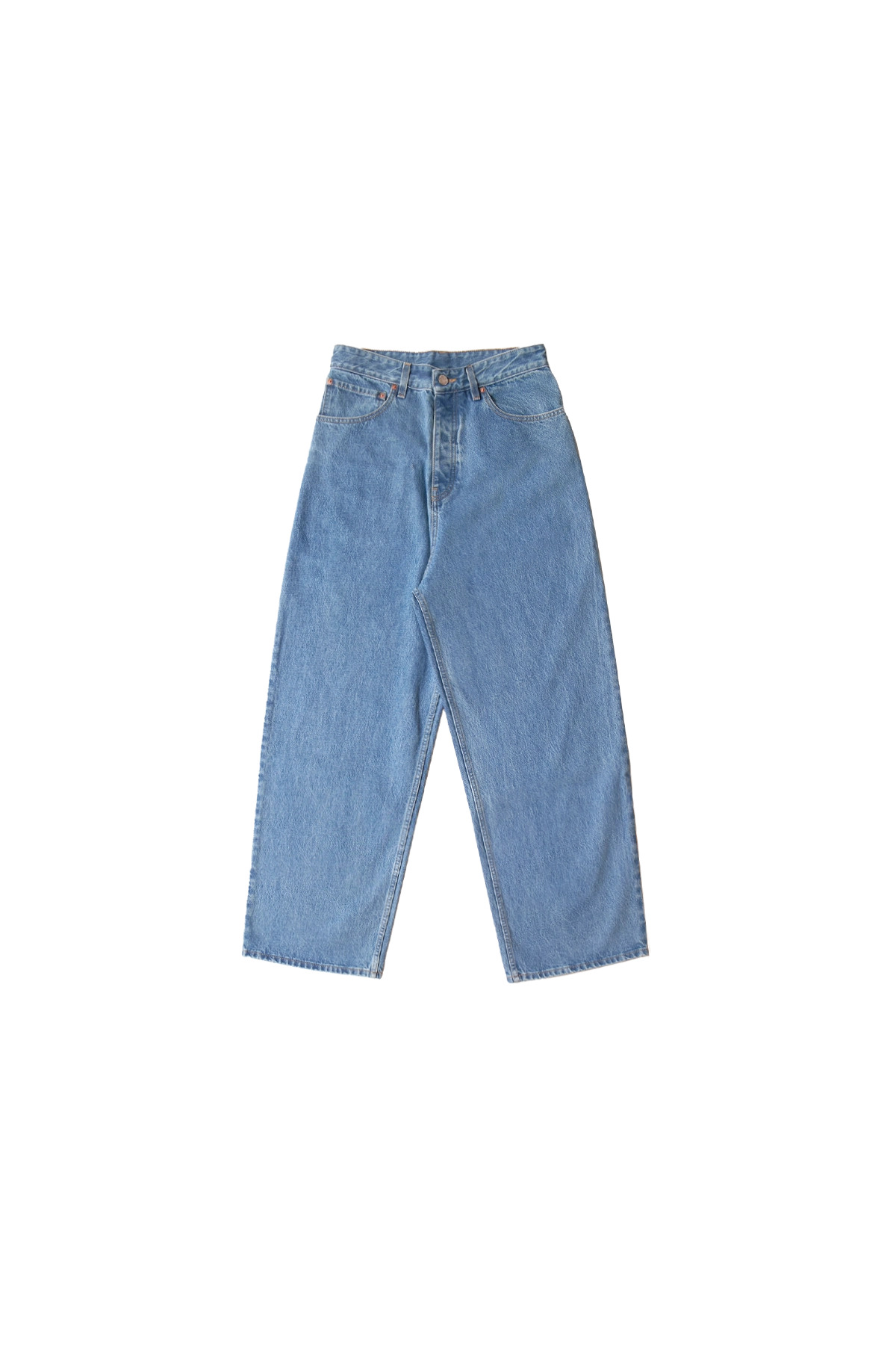 Vetements Baggy Jeans Mid Blue in faded non-stretch denim, with five-pocket styling, fading throughout, leather logo patch at back waistband, logo topstitching at back pockets, logo-engraved silver and copper-tone hardware, and contrast stitching in tan. DETAILS - Baggy-fit - Non-stretch denim - Fading throughout - Five-pocket styling - Zip-fly - Belt loops - Leather logo patch at back - Logo topstitching at back pockets - Logo-engraved silver and copper-tone hardware - Contrast stitching in tan Sizing: - True to size Material: 100% Cotton Made in Italy Product codes: - SKU: ESSX/VET/SS25/UA66PA540N/blue/28 - UPC: 7630983531517