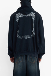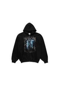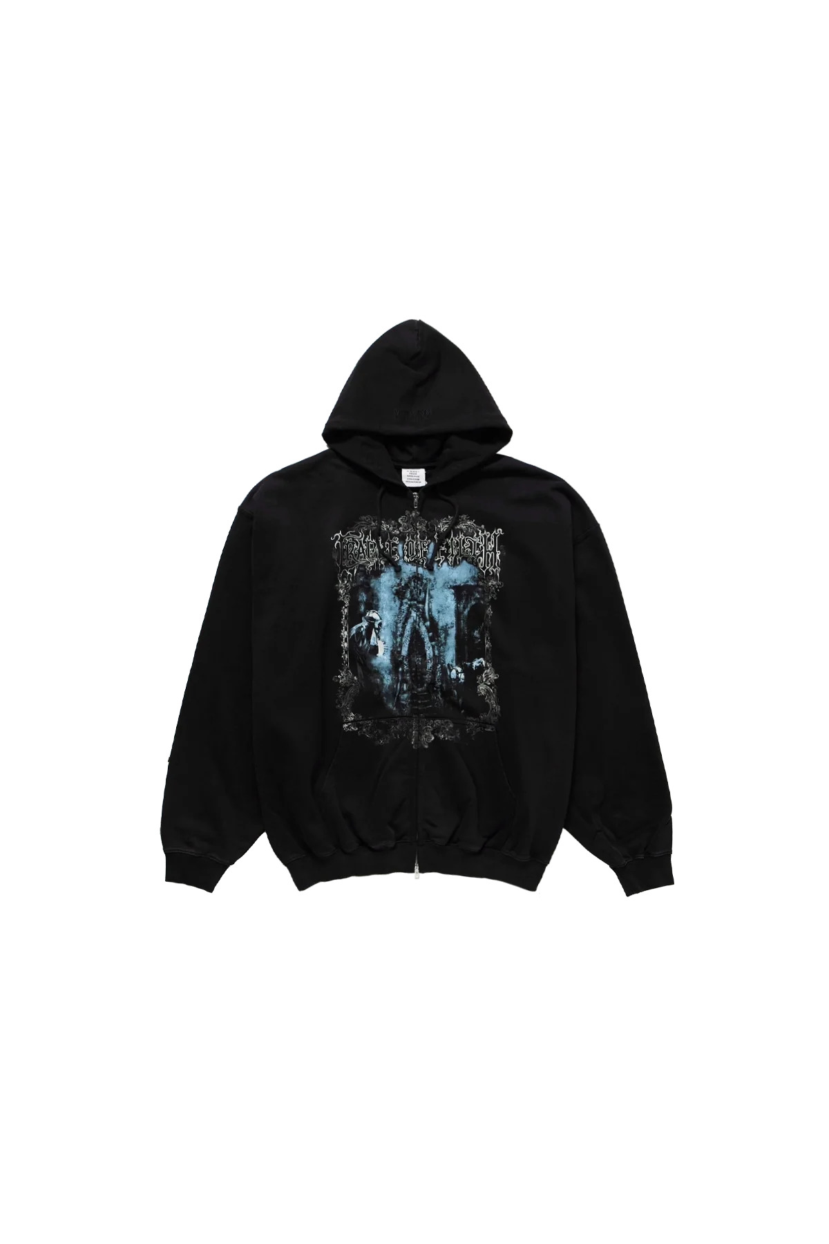 The Vetements Cof Butterfly Oversized Zip-Up Hoodie in washed french terry from the 'Cradle of Filth' capsule collection featuring an oversized, relaxed fit, dropped shoulders, a graphic print at the front and back, an embroidered logo at the hood, patch pockets, and front zip closure. Model is 5'10 and wears size medium DETAILS - French terry fabrication - Oversized fit - Dropped shoulders - Drawstring + embroidered logo at hood - Two-way zip closure - Text + graphic printed at front + back - Patch pockets at waist - Rib-knit hem + cuffs Sizing: - True to size Material: 100% Cotton Trim: 96% Cotton / 4% Elastane Made in Portugal Product codes: - SKU: ESSX/VET/AW25/UCF76ZU800B/Black/S - UPC: 7630983551850