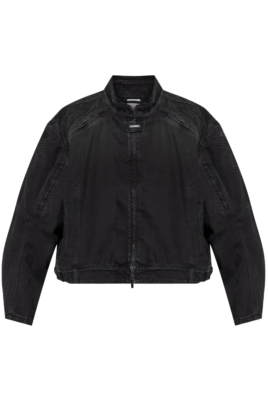 Vetements Racing Denim Jacket featuring embroidered logo detail at the zip vents in the back. Cut so the fit is oversized and relaxed, stand collar and boxy cut. Hidden zippered pockets throughout, heavy construction, perfect for layering. Oversized, boxy fit. DETAILS Fading throughout Stand collar Zip closure Zip pocket at chest Welt pockets at waist Velcro tabs at hem Quilted saddle shoulders Embroidered logo patch at sleeves Rubber logo patch at back collar Material: 100% Cotton Made in Italy Product codes: - SKU: ESSX/VET/AW25/UH76DJ900B2/Black/M - UPC: 7630983559306