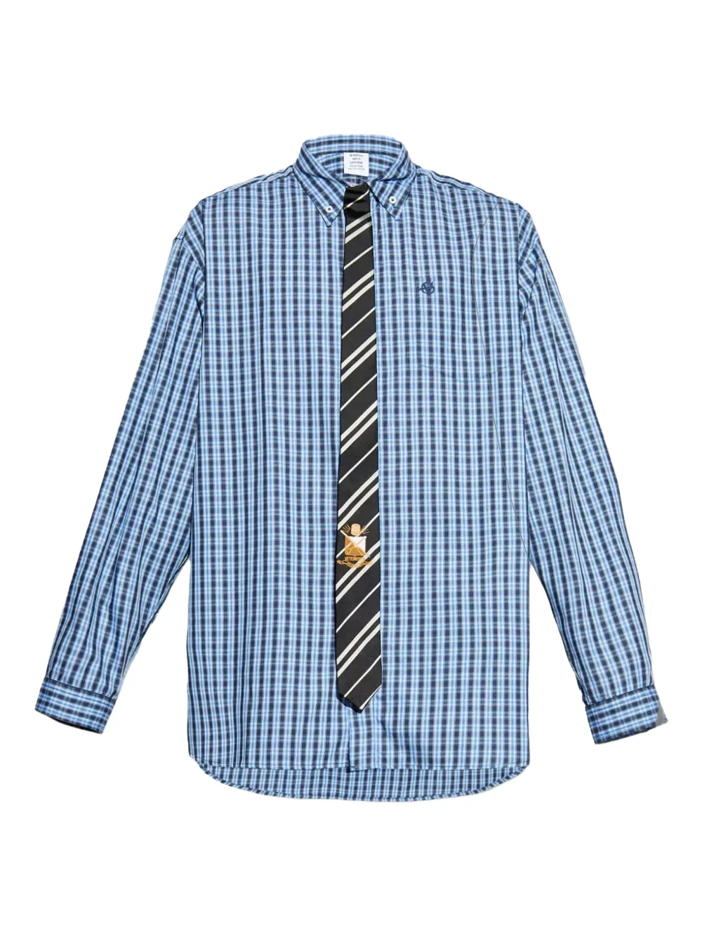 Vetements Tie Shirt collared poplin shirt featuring a crisp checkered pattern and silk tie detail. Designed for effortless layering and contemporary styling. Oversize Fit. DETAILS Check pattern throughout Spread collar Silk satin tie applique at concealed button closure Logo-embroidered patch pocket at chest Shirttail hem Buttoned barrel cuffs Box pleat at back yoke Material: 100% Cotton / 100% Silk Made in Italy Product codes: - SKU: ESSX/VET/AW25/UH76SH280CN/Blue/S - UPC: 7630983573135