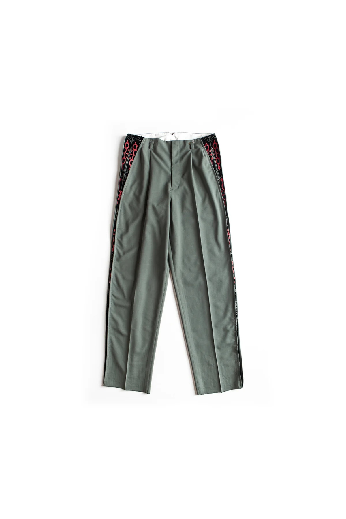 The WACKO MARIA Wolf's Head Rockabilly Pants in a fluid woven fabrication featuring a mid-rise, creased leg, side and back pockets, and contrasting printed velvet inserts at the sides. This item is final sale and is not eligible for return or exchange. DETAILS - Lightweight suiting fabrication - Zip fly with button closure - Four-pocket styling - Front pintuck detail - Side velvet paneling - Belt loops Sizing: - True to size Material: 100% Wool Contrast Fabric: 100% Cotton Made in Japan Product codes: - SKU: ESSX/WAC/WOLFSHEADWMPT19/GRY/S - UPC: 2100002011191