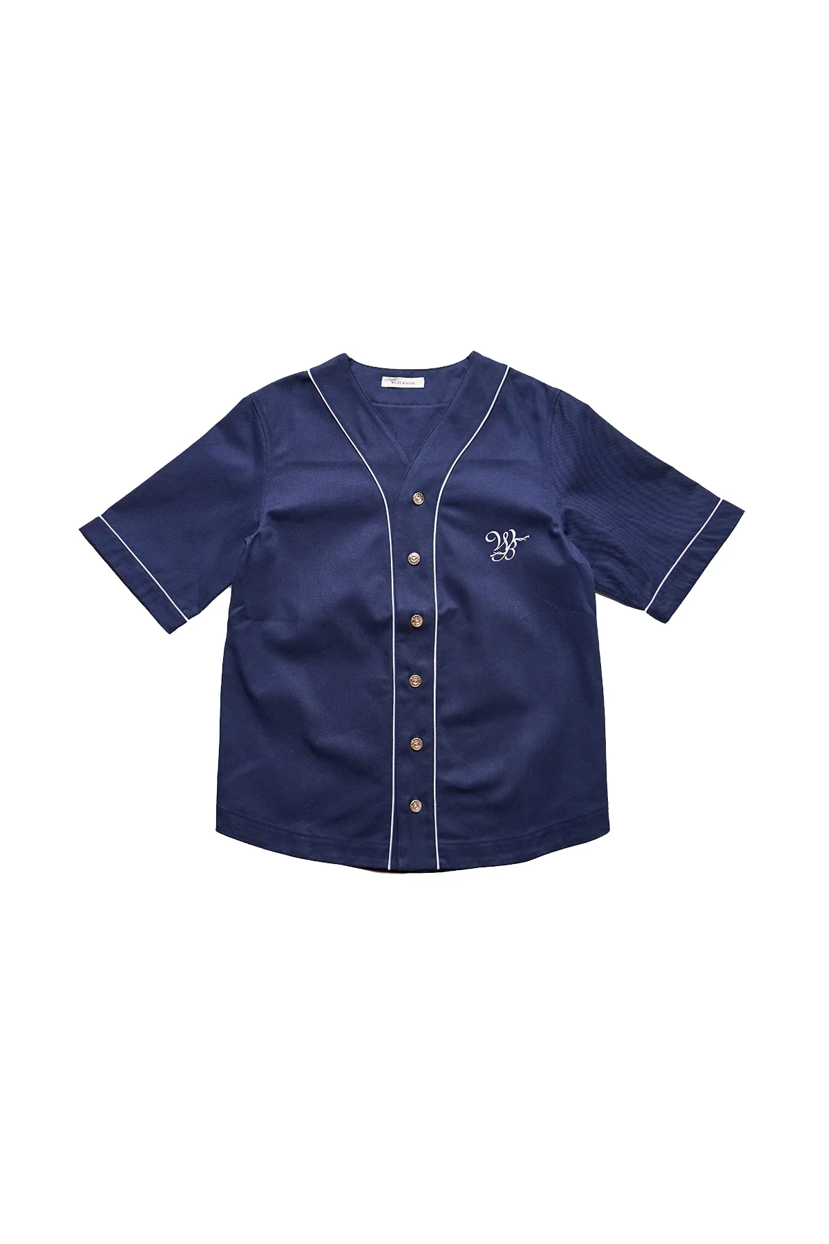 Wales Bonner Freestyle Shirt Navy DETAILS - Short sleeve baseball jersey style shirt - Front button closure - V-neck - White contrast piping - Logo at chest - Made in Portugal Sizing: - True to size Material: Fabric: 100% Cotton Lining: 100% Cotton Trim: 100% Viscose Product codes: - SKU: ESSX/MA24SH18CO15599/NAVY/46 - UPC: 1403558012430