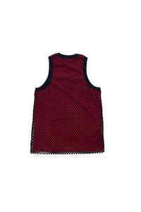 The Wales Bonner Record Mesh Tank Top in red and black paneled knit and jersey construction with a diamond grid pattern top layer, scoop neck, relaxed fit, and tonal logo embroidered at the straight hem. DETAILS - Lightweight mesh - Relaxed-fit - Athletic-inspired silhouette - Sleeveless - Scoop neckline - Contrast trim at neck + arms - Straight hem - Embroidered branding Sizing: - True to size Material: Main: 97% Polyester / 3% Spandex Secondary: 100% Organic Cotton Made in Portugal Product codes: - SKU: ESSX/WAL/SS25/MS25JE40JE01349/red/S - UPC: 1403558029926