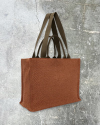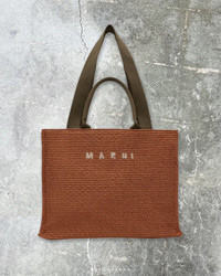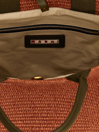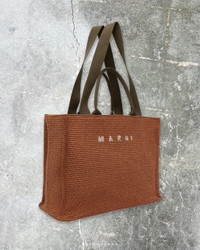 Woven faux-raffia tote in orange. · Twin rolled carry handles · Fixed webbing shoulder strap · Logo embroidered at face · Leather post-stud tab at throat · Zip pocket at interior · Cotton twill lining · H13" x W17" x D8.5" Supplier color: Brick/Olive Textile. Made in Italy. 241379M172040