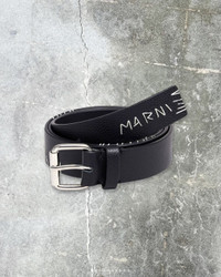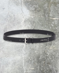 black grained texture embroidered logo embroidered design silver-tone buckle fastening punched holes adjustable fit Calf Leather 100%