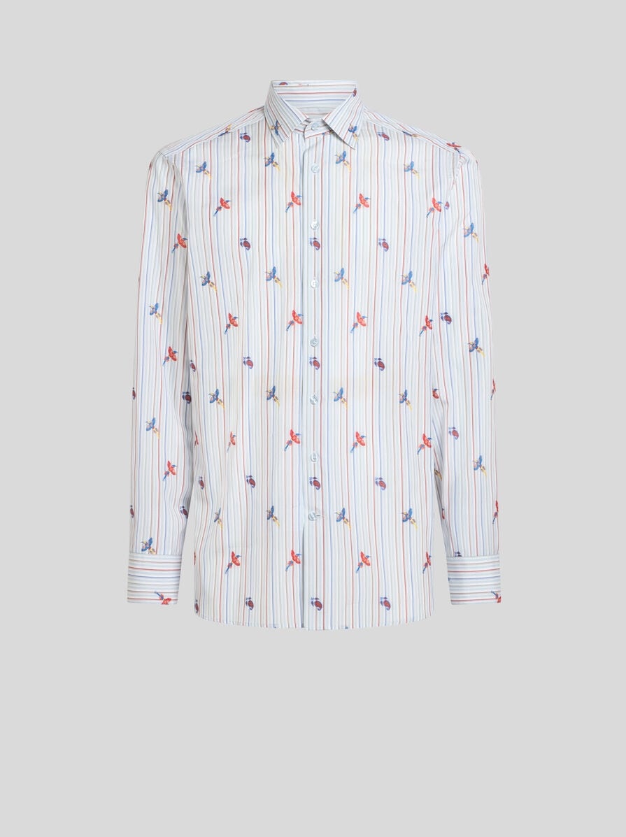 Striped pure cotton jacquard shirt with archive-sourced, tie-style hummingbird and micro Paisley motif. • Roma regular fit • Pointed collar • Button closure • Double-buttoned working cuffs • Made in Italy • The model is 6' 1½" (187 cm) tall and wears a size 39 (IT) PRODUCT DETAILS • 100% cotton