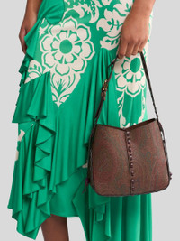 Medium Vulcano Bag in iconic Paisley jacquard fabric. This item boasts a special construction with threading and a fully suede-lined interior with ring closure. The adjustable handle allows you to carry it by hand or on the shoulder, and is finished with lacing and marbles at the end. The accessory was presented at the Spring-Summer 25 Women's Runway Show. • Dimensions (Width, Height, Depth): 8.7 x 8.3 x 3.7 inches (22 x 21 x 9.5 cm) • Adjustable handle • Inner ring closure • Made in Italy PRODUCT DETAILS • Exterior: Paisley jacquard cotton fabric coated with matt texture and lined with canvas • Coating: 100% PVC • Detailing: calfskin • Appliques: 100% polymethylmethacrylate • Lining: calfskin