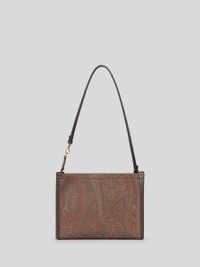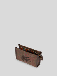 Pouch made from iconic Paisley jacquard fabric, with leather details, and ETRO logo and Pegaso symbol embroidered on the front. Contrasting inner lining in striped jacquard fabric. • 5.9 x 8.27 x 1.57 inches (15 x 21 x 4 cm) • Zip closure • Removable handle • Internal patch pocket • Golden-finish metal accessories • Made in Italy PRODUCT DETAILS • Exterior: Paisley jacquard cotton fabric coated with matt texture and lined with canvas • Details: 100% leather • Embroidery: 100% polyester • Lining: 100% polyester