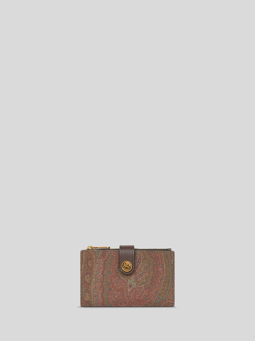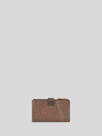 Wallet in iconic Paisley jacquard fabric, embellished with metal button bearing the raised Pegaso logo. • Dimensions (Width, Height): 5.7 x 3.3 inches (14.5 x 8.5 cm) • Flap and press-stud closure • Golden-finish metal details • Pegaso button • Zipped main pocket • Made in Italy PRODUCT DETAILS • Exterior: Paisley jacquard cotton fabric coated with matt texture and lined with canvas • Coating: 100% PVC • Trims: calfskin • Details: calfskin • Interior: 100% nylon
