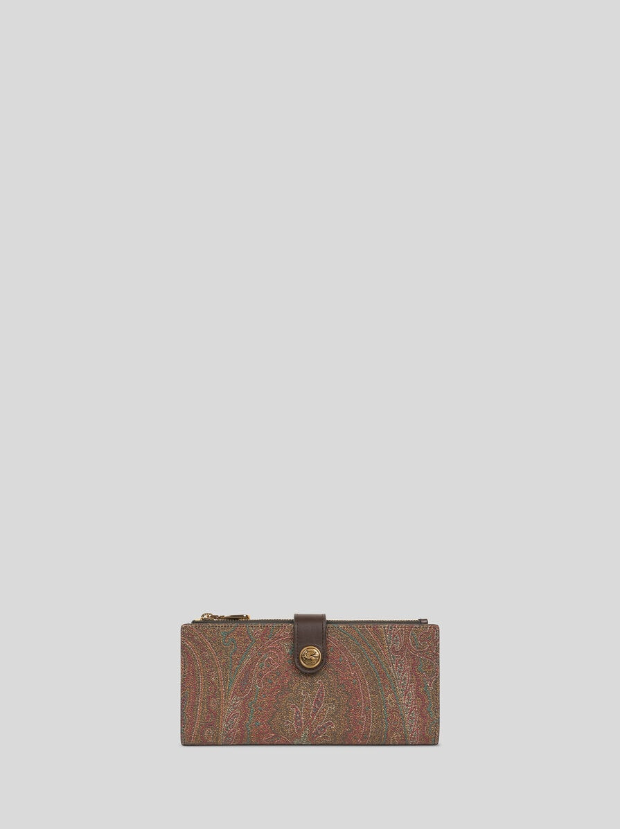 Wallet in iconic Paisley jacquard fabric. This accessory is embellished with a metal button bearing the raised Pegaso symbol and an etched Etro logo on the inside. • Dimensions (Width, Height): 7.5 x 3.5 inches (19 x 9 cm) • Flap and press-stud closure • Golden-finish metal details • Pegaso button • Zipped main pocket • Banknote compartments • Fourteen card slots • Made in Italy PRODUCT DETAILS • Exterior: Paisley jacquard cotton fabric coated with matt texture and lined with canvas • Coating: 100% PVC • Trims: calfskin • Details: calfskin • Interior: 100% nylon