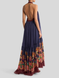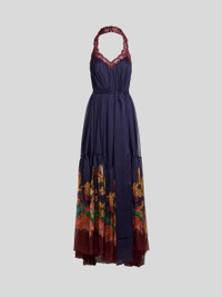 Boho-style long dress in light silk crepon, whose skirt features a voluminous flounce embellished with a scarf-inspired floral print. This item, inspired by a piece presented at the Spring-Summer 25 Women's Runway Show, features an opening at the top of the back, stands out for its flowing fit and is enhanced by a refined lace insert adorning the halterneck. Completing the dress is a soft sash that can be worn as either a belt or scarf. • Loose fit • Halterneck • Sash for use as a belt or scarf • Made in Italy • The model is 5' 9½" (177 cm) tall and wears a size 40 PRODUCT DETAILS • 100% silk • Lace: 100% polyamide • Lining: 100% polyester