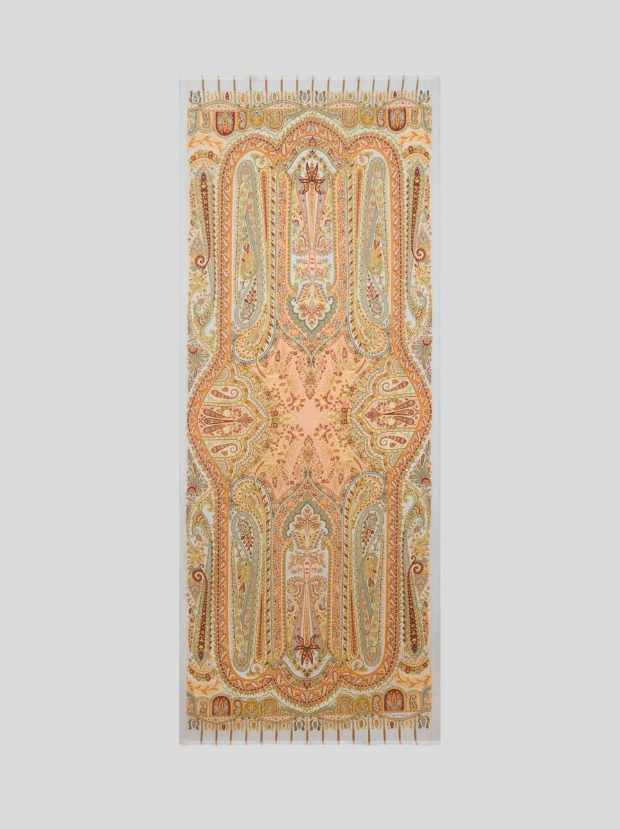 Cashmere- and silk-blend scarf embellished with dense symmetrical floral-inspired motif with Paisley details. The ETRO logo and slightly frayed short sides complete the design. • Size: 27.6 x 66.9 inches (70 x 170 cm) • Made in Italy PRODUCT DETAILS • 70% cashmere, 30% silk