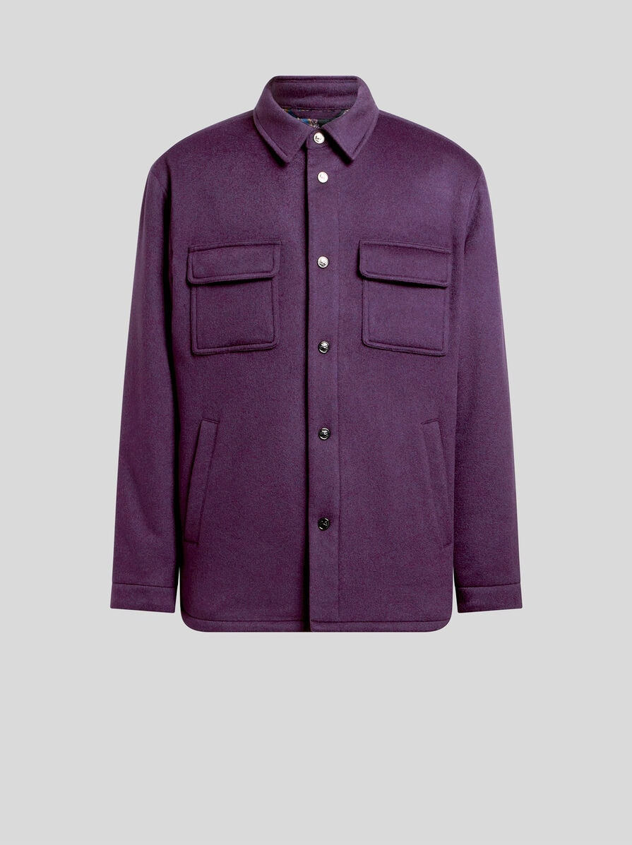Plain-coloured pure cashmere overshirt with inner padding. This model also fastens with press studs featuring a raised Pegaso symbol at the front. • Easy fit • Pointed collar • Pegaso press-stud closure • Patch pockets on the front • Side slip pockets • Made in Romania • The model is 6' 1½" (187 cm) tall and wears a size M PRODUCT DETAILS • 100% cashmere • Lining: 100% viscose • Padding: 100% polyester
