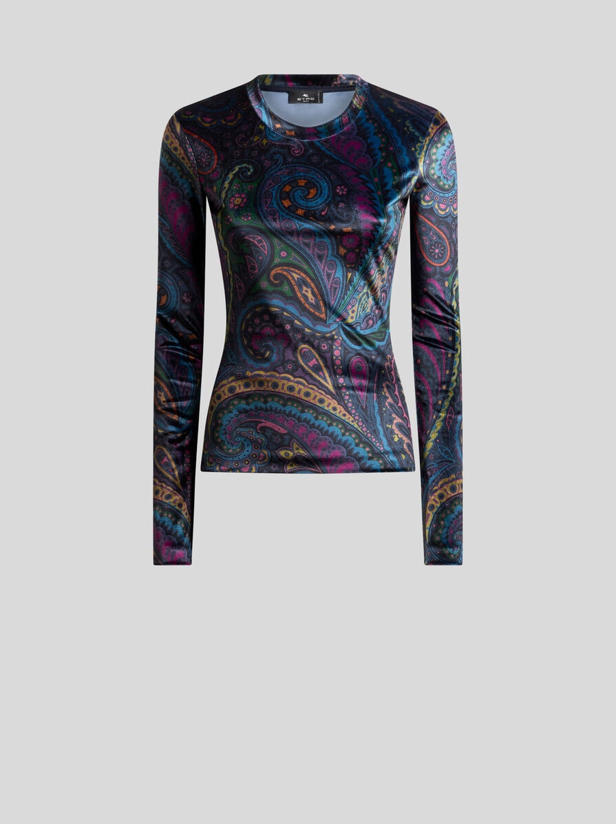 Long-sleeved top in soft stretch chenille with all-over multicoloured paisley print. • Slim fit • Crewneck • Long sleeves • Made in Italy • The model is 5' 9½" (177 cm) tall and wears a size 40 PRODUCT DETAILS • 93% polyester, 7% elastane