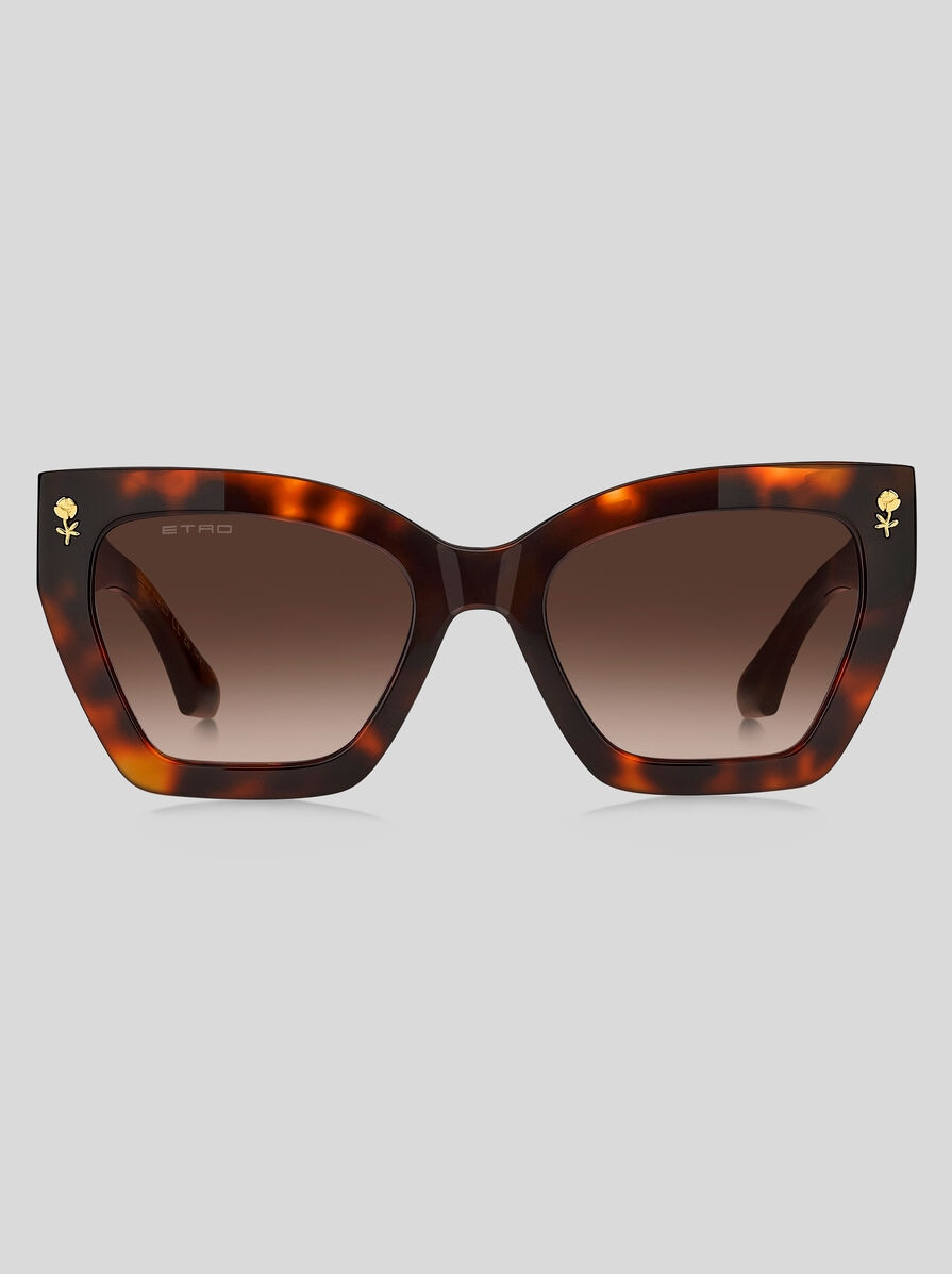Evolving ETRO's "Colour Stripes" story for the new season, these sunglasses are designed to be seen. The bold acetate frame is bevelled around the front for lightness and paired with geometric temples in a sheer ombre palette that allows the graphic metal wirecore to peek through. Notice the floral details inspired by intricate embroidery techniques, the famous ETRO logo and the signature temple tips. The colour palette blends classic tones with intriguing transparencies to striking effect. PRODUCT DETAILS • Frame: acetate • Lenses with UVA and UVB protection • Fitting: international • Lens: 43,7mm, bridge: 21mm, temple: 145mm • Made In China
