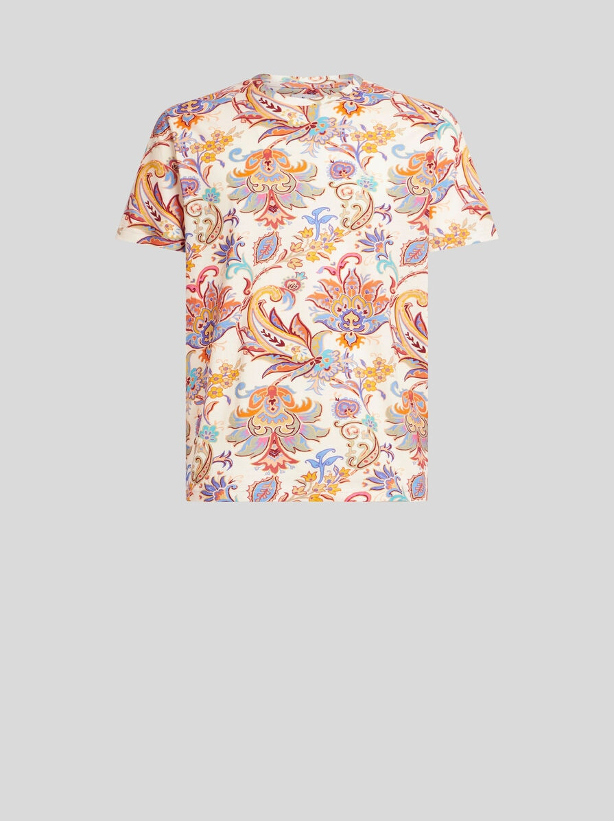 Crew-neck T-shirt in cotton- and linen-blend fabric embellished with all-over floral print. • Roma regular fit • Crewneck • Short sleeves • Made in Italy • The model is 6' 1½" (187 cm) tall and wears a size M PRODUCT DETAILS • 85% cotton, 15% linen
