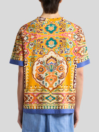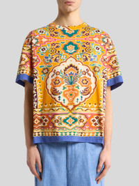 Crew-neck T-shirt in cotton- and linen-blend fabric with placed geometric and floral print. This model is complete with contrasting edging at the sleeve ends and hem. • Regular fit • Ribbed crewneck • Short sleeves • Made in Italy • The model is 6' 1½" (187 cm) tall and wears a size M PRODUCT DETAILS • 85% cotton, 15% linen