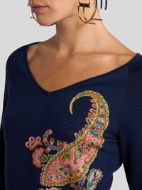 Slim-fitting V-neck sweater in lightweight cotton-blend jacquard fabric. This model stands out for the front inlays featuring the iconic Paisley motif enhanced by floral-inspired details. • Fitted • V-neck • Long raglan sleeves • Ribbed edging • Made in Italy • The model is 5' 9½" (176 cm) tall and wears a size 40 PRODUCT DETAILS • 90% cotton, 8% viscose, 1% polyester, 1% metallised fibre