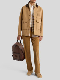 Workwear-inspired jacket in pure cotton fabric with contrasting velvet collar. This garment features a decorative Pegaso and ETRO monogram embroidered on the front. • Regular fit • Pointed collar • Button closure at the front • Patch pockets on the front • Made in Romania • The model is 6' 1½" (187 cm) tall and wears a size M PRODUCT DETAILS • 100% cotton • Sleeve lining: 52% viscose, 48% acetate