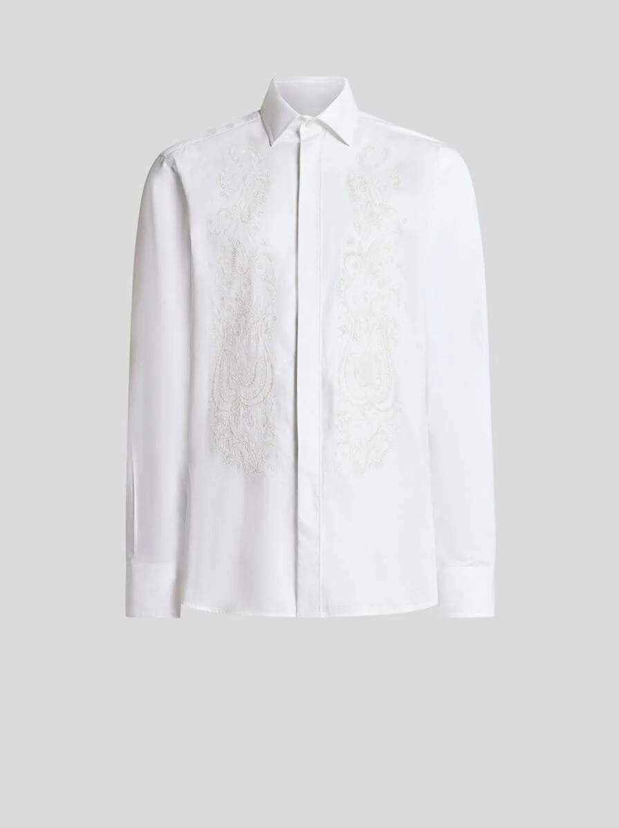 Shirt in pure plain-coloured cotton. This model features distinctive, placed tone-on-tone Paisley and floral elements embroidered on the front. • Regular fit • Pointed collar • Concealed button closure • One-button working cuffs • Made in Italy • The model is 6' 1" (186 cm) tall and wears a size 39 PRODUCT DETAILS • 100% cotton
