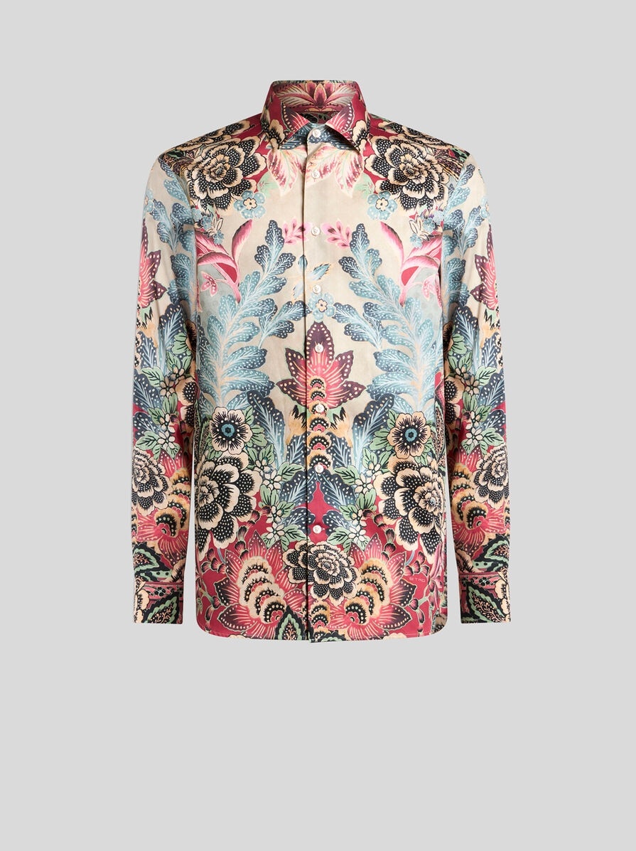 Pure cotton shirt with decorative, placed flower and foliage print. • Roma regular fit • Pointed collar • Button closure • Double-buttoned working cuffs • Made in Italy • The model is 6' 1½" (187 cm) tall and wears a size 39 (IT) PRODUCT DETAILS • 100% cotton