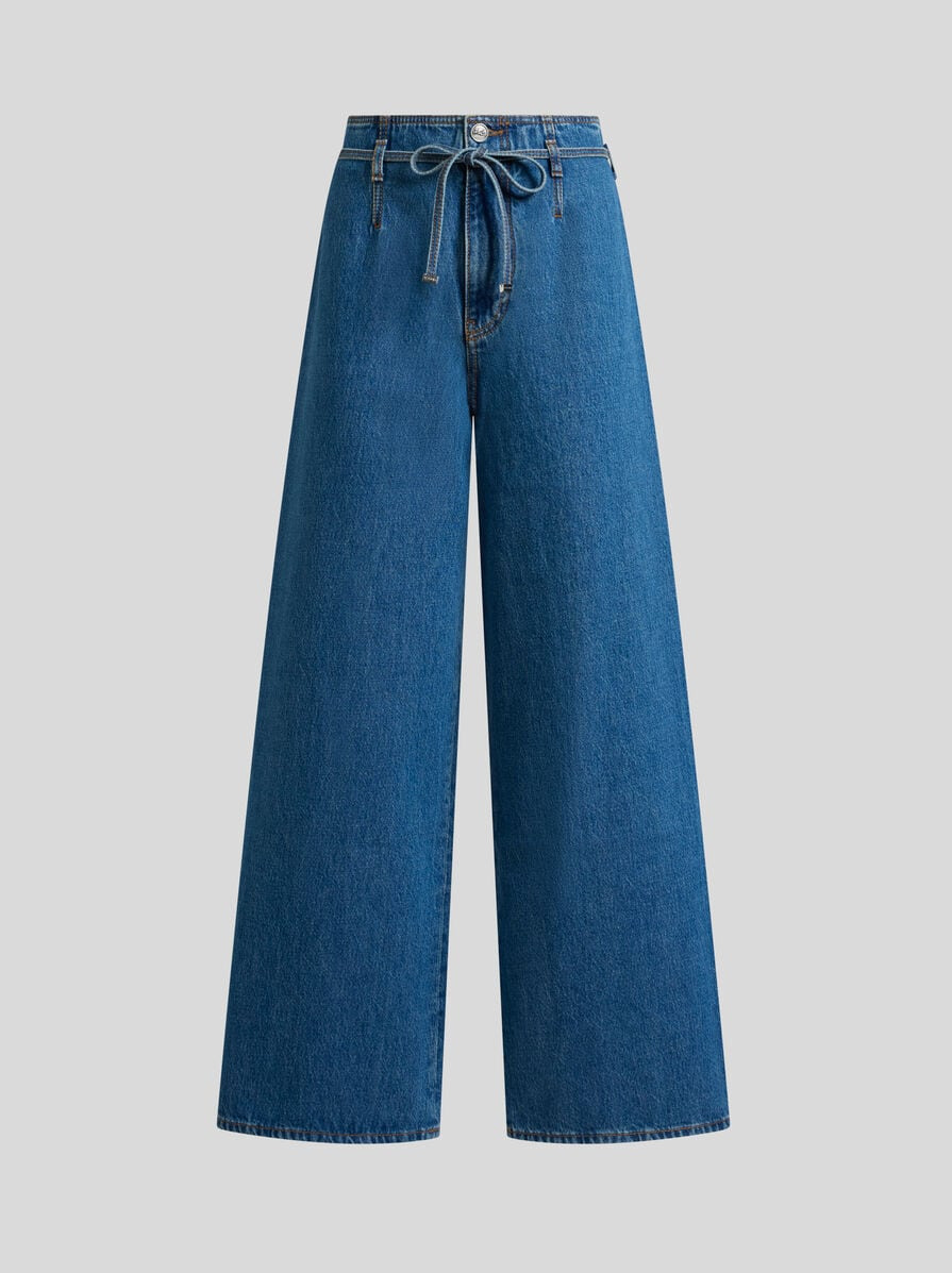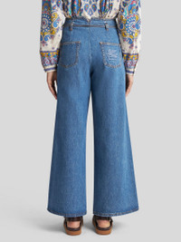 Culotte jeans with wide leg hems, high waist and detachable belt. This model is made from pure cotton denim and is enhanced by a metal button with a raised Pegaso logo and the Pegaso symbol and Etro monogram embroidered on the rear pocket. • Regular fit • High waist • Two rear pockets • Pegaso button and zip closure • Detachable waist belt • Made in Italy • The model is 5' 9½" (177 cm) tall and wears a size 26 (IT) PRODUCT DETAILS • 100% cotton