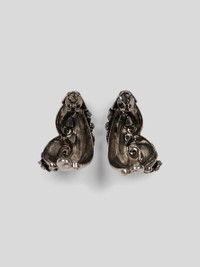 Vintage-finish brass earrings with distinctive curly shape, decorative engravings and raised flowers. • Made in Italy PRODUCT DETAILS • 100% brass