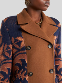 Long double-breasted coat in plain-coloured wool-blend cloth. This model features knit pure wool inserts with a floral jacquard motif and is complete with a martingale belt-style detail on the back. • Regular fit • Lapel collar • Double-breasted closure with buttons • Side slip pockets • Rear vent • Made in Italy • The model is 5' 9½" (177 cm) tall and wears a size 40 PRODUCT DETAILS • Main fabric: 70% wool, 30% polyamide • Knit inserts: 100% wool • Lining: 52% viscose, 48% acetate