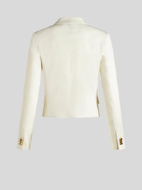 Cropped jacket in stretch cotton gabardine enhanced by metal buttons with a raised Pegaso logo. • Fitted • Peak lapel collar • Double-breasted closure with Pegaso buttons • Welt breast pocket • Side slip pockets with flap • Cuffs with Pegaso buttons • Rear vents • Made in Italy • The model is 5’10” (178 cm) tall and wears a size 40 (IT) PRODUCT DETAILS • 97% cotton, 3% elastane • Lining: 100% viscose