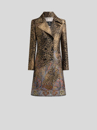 Knee-length coat with double-breasted closure, featuring the iconic Paisley with floral elements, superimposed over a jacquard animal pattern. This fitted piece features a wide lapel collar and is complete with flap pockets at the sides. • Slim fit • Lapel collar • Double-breasted closure with buttons • Side slip pockets with flap • Made in Italy • The model is 5' 9½" (176 cm) tall and wears a size 40 PRODUCT DETAILS • Exterior: 100% polyester • Lining: 52% viscose, 48% acetate
