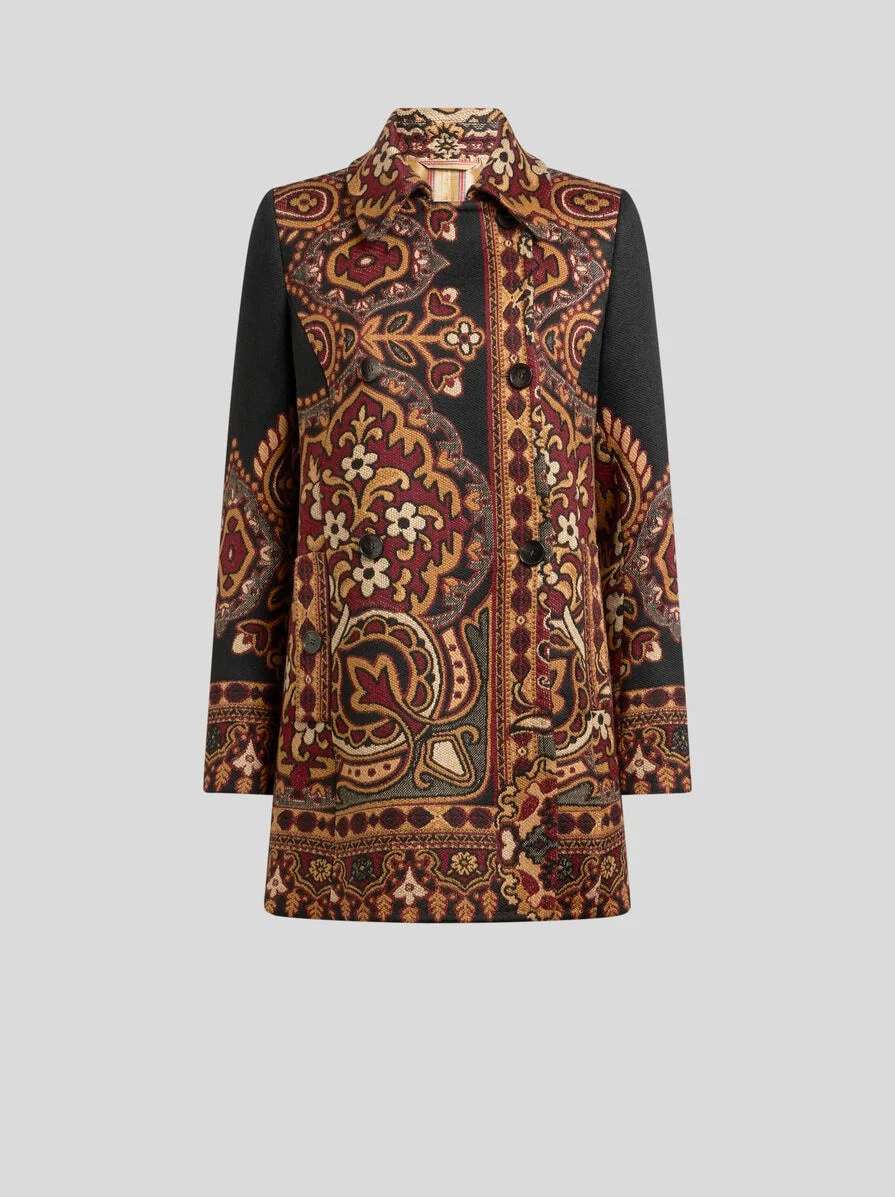 Short coat in wool-blend jacquard fabric. This item features an elaborate floral motif and is complete with a double-breasted closure with buttons sporting the ETRO logo. • Regular fit • Shirt collar • Double-breasted closure with branded buttons • Button-through welt pockets with logo at the sides • Made in Italy • The model is 5' 9½" (176 cm) tall and wears a size 40 PRODUCT DETAILS • Exterior: 46% wool, 46% acrylic, 8% cotton • Lining: 52% viscose, 48% acetate