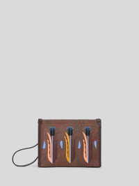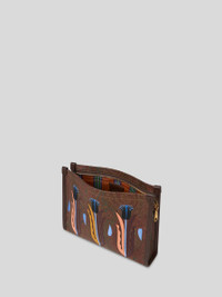 Medium pouch made from iconic Paisley jacquard fabric, with leather details, embellished with an embroidered motif inspired by the works of the artist Agostino Iacurci. Contrasting inner lining in striped jacquard fabric. • Size (Width, Height, Depth): 9.6 x 7.1 x 1.8 inches (24.5 x 18 x 4.5 cm) • Zip closure • Detachable wrist strap • Internal patch pocket • Golden-finish metal accessories • Made in Italy PRODUCT DETAILS • Exterior: Paisley jacquard cotton fabric coated with matt texture and lined with canvas • Coating: 100% PVC • Details: 100% calfskin