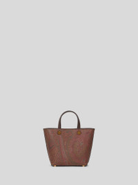 Mini ETRO Essential tote bag in iconic Paisley jacquard fabric, with leather details. Embellished with a raised Pegaso symbol and ETRO logo,, it features an embroidered motif inspired by the works of the artist Agostino Iacurci. It has a detachable shoulder strap. • Size (Width, Height, Depth): 6.3 x 6.3 x 3.5 inches (16 x 16 x 9 cm) • Fastened with magnetic button • Two handles • Detachable adjustable shoulder strap • Metal feet • Golden-finish metal accessories • Made in Italy PRODUCT DETAILS • Exterior: Paisley jacquard cotton fabric coated with matt texture and lined with canvas • Coating: 100% PVC • Embroidery: 100% polyester • Details: calfskin