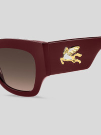 Refined and quintessentially ETRO, these sunglasses make a stunning statement with their bold shape, exquisite construction and the precious Pegaso detail – crafted from a single piece of metal to create an unexpected cutout effect. They're made from premium acetate developed exclusively for the brand, finished using a milling process, and available in classic black, ETRO's burgundy, and Paisley-patterned variations that give fresh energy to heritage codes. PRODUCT DETAILS • Frame: acetate • Lenses with UVA and UVB protection • Fitting: international • Lens: 44,7mm, bridge: 22mm, temple: 140mm • Made In China