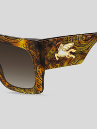 Refined and quintessentially ETRO, these sunglasses make a stunning statement with their bold shape, exquisite construction and the precious Pegaso detail – crafted from a single piece of metal to create an unexpected cutout effect. They're made from premium acetate developed exclusively for the brand, finished using a milling process, and available in classic black, ETRO's burgundy, and Paisley-patterned variations that give fresh energy to heritage codes. PRODUCT DETAILS • Frame: acetate • Lenses with UVA and UVB protection • Fitting: international • Lens: 48,7mm, bridge: 22mm, temple: 140mm • Made In China
