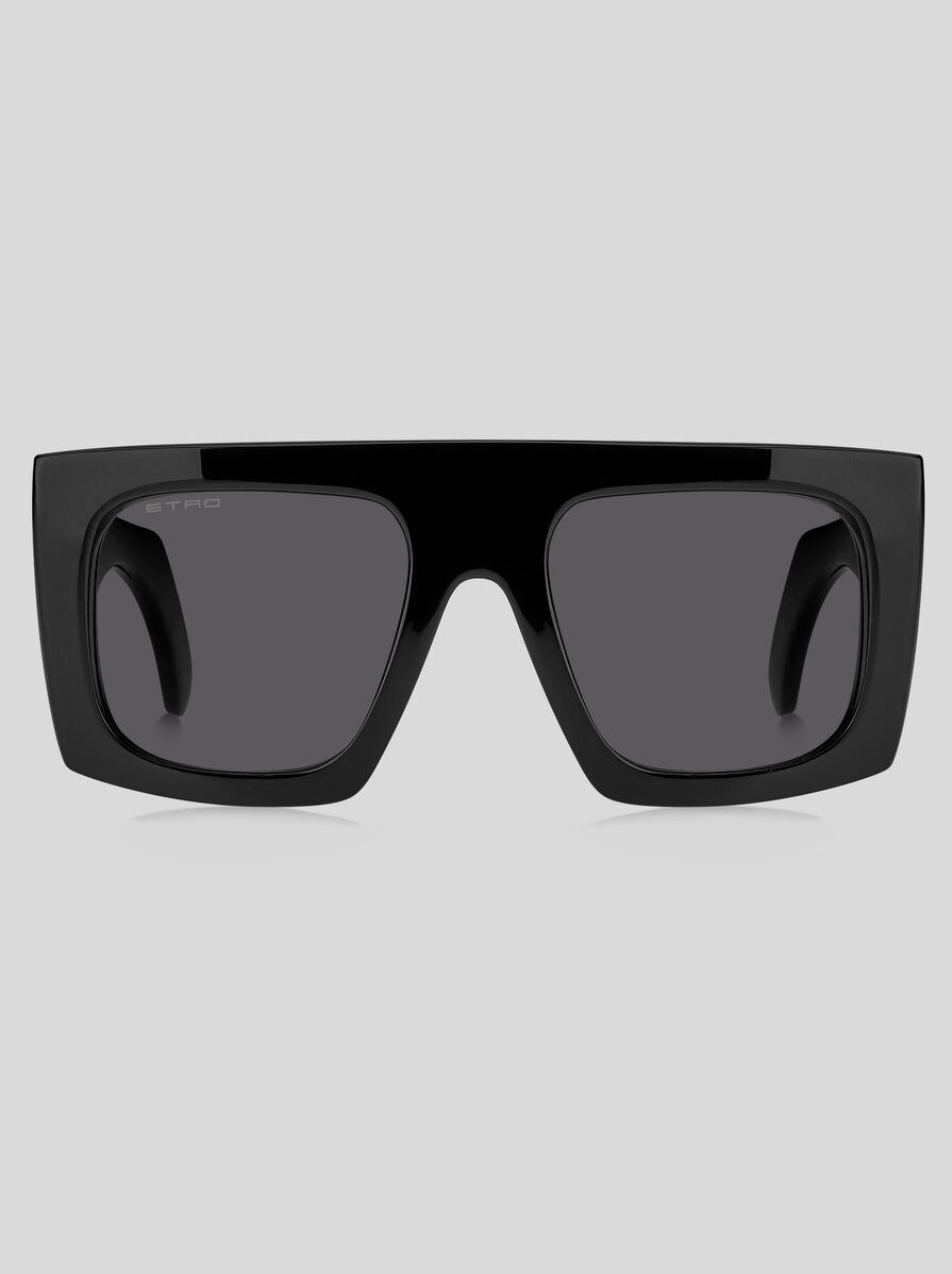 ETRO's "Etroscreen" eyewear styles channels the Maison's impactful elegance through eccentric shapes and heritage details. The bold volumes of these genderless sunglasses are enhanced by a monochrome approach, while the Pegaso logo in matching or gold-tone metal graces the geometric temples. Iconic end tips, designed to recreate the symmetry of the ETRO logo, lend these frames an instantly recognisable touch. The lasered "ETRO" logo on the tinted lens is a signature finishing touch. PRODUCT DETAILS • Frame: 100% polyamide • Lenses with UVA and UVB protection • Fit: International • Lenses:Lenses: 1.88 inches, bridge: 0.82 inches, temples: 5.51 inches ( 47,9 mm, bridge: 21 mm, temples: 140 mm) • Made in Italy