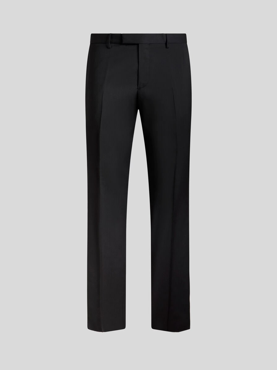 Plain-coloured evening trousers in pure virgin wool. The silk-blend side band detail completes the garment. • Slim fit • Welt side slip pockets • Rear welt pockets • Fastened with concealed zip and off-centre button • Belt loops • Side band detail down the leg • Pressed creases • Made in Italy • The model is 6' 1½" (187 cm) tall and wears a size 48 PRODUCT DETAILS • 100% wool • Side band: 78% silk, 22% polyester • Lining: 60% acetate, 40% viscose