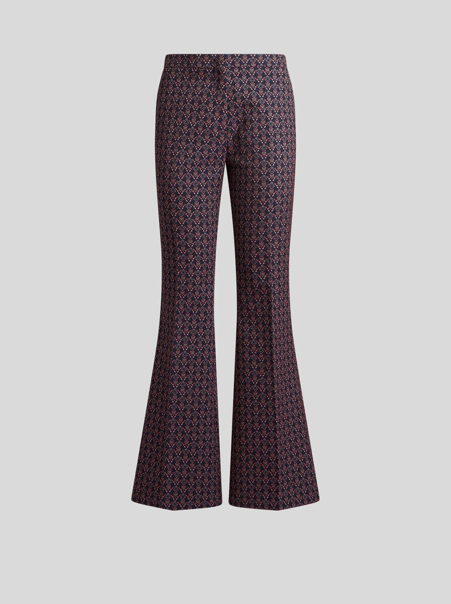 Flared-leg trousers in cotton-blend jacquard fabric with slight stretch. These stand out for their classic pressed creases and tie-inspired all-over motif. • Flared fit • Side slip pockets • Rear welt pockets • Concealed hook and zip closure • Made in Italy • The model is 5' 9½" (177 cm) tall and wears a size 40 PRODUCT DETAILS • 59% cotton, 20% polyester, 19% nylon, 2% elastane