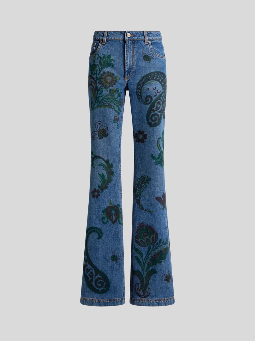 Five-pocket jeans with snug fit at the sides, flared hems and nature-inspired Paisley, flower and bee print. Made from cotton denim, this piece is enhanced by a metal button with a raised Pegaso and a rear label sporting the ETRO logo and Pegaso symbol. The item was presented at the Autumn-Winter 25 Runway Show. • Regular fit • Regular waist • Five pockets • Belt loops • Concealed zip and Pegaso button closure • Rear label with ETRO logo and Pegaso • Made in Italy • The model is 5' 9½" (176 cm) tall and wears a size 26 PRODUCT DETAILS • 100% cotton