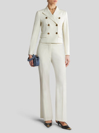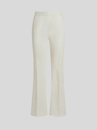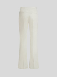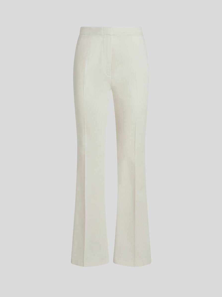 Flare-fit trousers with pressed creases,, snug fit at the sides and flared bottom. This model is made from stretch cotton gabardine. • Slim fit • High waist • Hook and zip closure • Side pockets • Rear welt pockets • Made in Italy • The model is 5’10” (178 cm) tall and wears a size 40 (IT) PRODUCT DETAILS • 97% cotton, 3% elastane