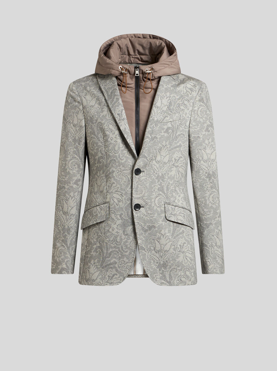 Single-breasted blazer in pure cotton jacquard fabric with an all-over floral design. This model features a removable nylon vest insert with a hood and zip. Contrasting undercollar and lining. • Regular fit • Classic lapels • Single-breasted closure with two branded buttons • Two flap pockets at the front and welt breast pocket • Cuffs with four buttons • Bib • Drawstring hood • Made in Italy • The model is 6' 1½" (187 cm) tall and wears a size 48 PRODUCT DETAILS • 100% cotton • Hood: 100% polyamide • Bodice lining: 52% viscose, 48% acetate • Sleeve lining: 57% viscose, 43% polyester
