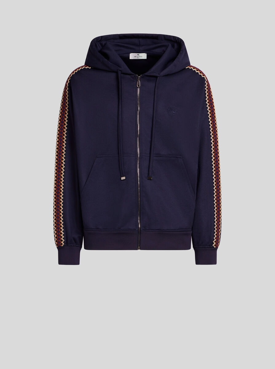 Hooded sweatshirt in plain-coloured, pique-stitched cotton-blend jersey. This model features distinctive side bands sporting a contrasting, multicoloured geometric motif and is complete with a small, tone-on-tone embroidered Pegaso logo on the chest. • Easy fit • Drawstring hood • Zip closure • Side slip pockets • Made in Italy • The model is 6' 1½" (187 cm) tall and wears a size M PRODUCT DETAILS • 55% polyester, 45% cotton • Details: 88% acrylic, 12% polyester