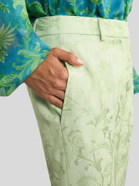 Bootcut trousers in viscose cloque fabric with slightly raised-effect texture. This pair features a delicate floral jacquard motif and is finished with pressed creases on the front and back. • Regular fit • High waist • Concealed closure • Welt side slip pockets • Rear button-through welt pockets • Made in Italy • The model is 5' 9½" (176 cm) tall and wears a size 40 PRODUCT DETAILS • 100% viscose