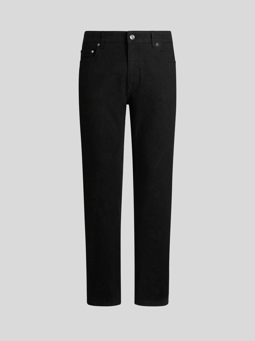 Jeans in stretch cotton-blend denim with an all-over tone-on-tone jacquard motif. This five-pocket model is embellished with a leather label featuring the Pegaso symbol and ETRO logo. • Roma fit • Concealed zip and button closure • Rear leather label with ETRO logo and Pegaso • Made in Italy • The model is 6' 1½" (187 cm) tall and wears a size 32 PRODUCT DETAILS • 56% cotton, 41% polyester, 3% elastane