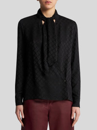 Wraparound shirt with scarf collar that ties into a bow. This model is made from silk-blend jacquard crepe de chine with a tone-on-tone geometric motif all over. • Regular fit • Scarf collar • Long sleeves • Working cuffs • Button closure • Made in Italy • The model is 5’10” (178 cm) tall and wears a size 40 (IT) PRODUCT DETAILS • 50% silk, 50% viscose