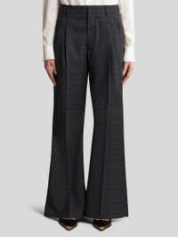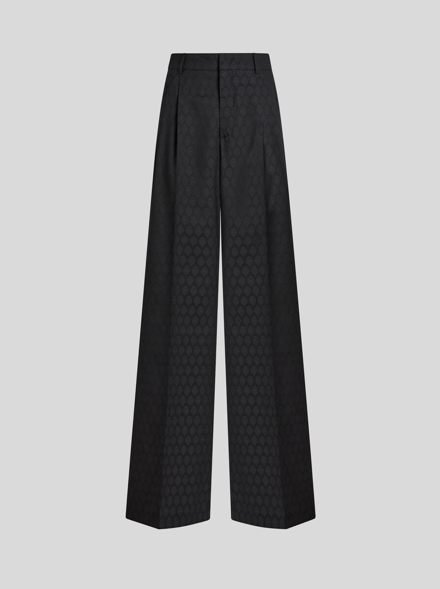 Wide-leg, menswear-inspired trousers in wool and cotton jacquard fabric with geometric, tone-on-tone tie-style motif all over. This high-waist model features pleats and pressed creases. • Loose fit • High waist • Hook and zip closure • Side pockets • Rear welt pockets • Made in Italy • The model is 5’10” (178 cm) tall and wears a size 40 (IT) PRODUCT DETAILS • 100% wool