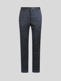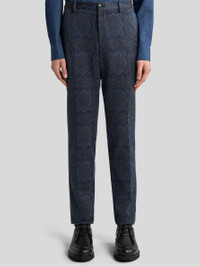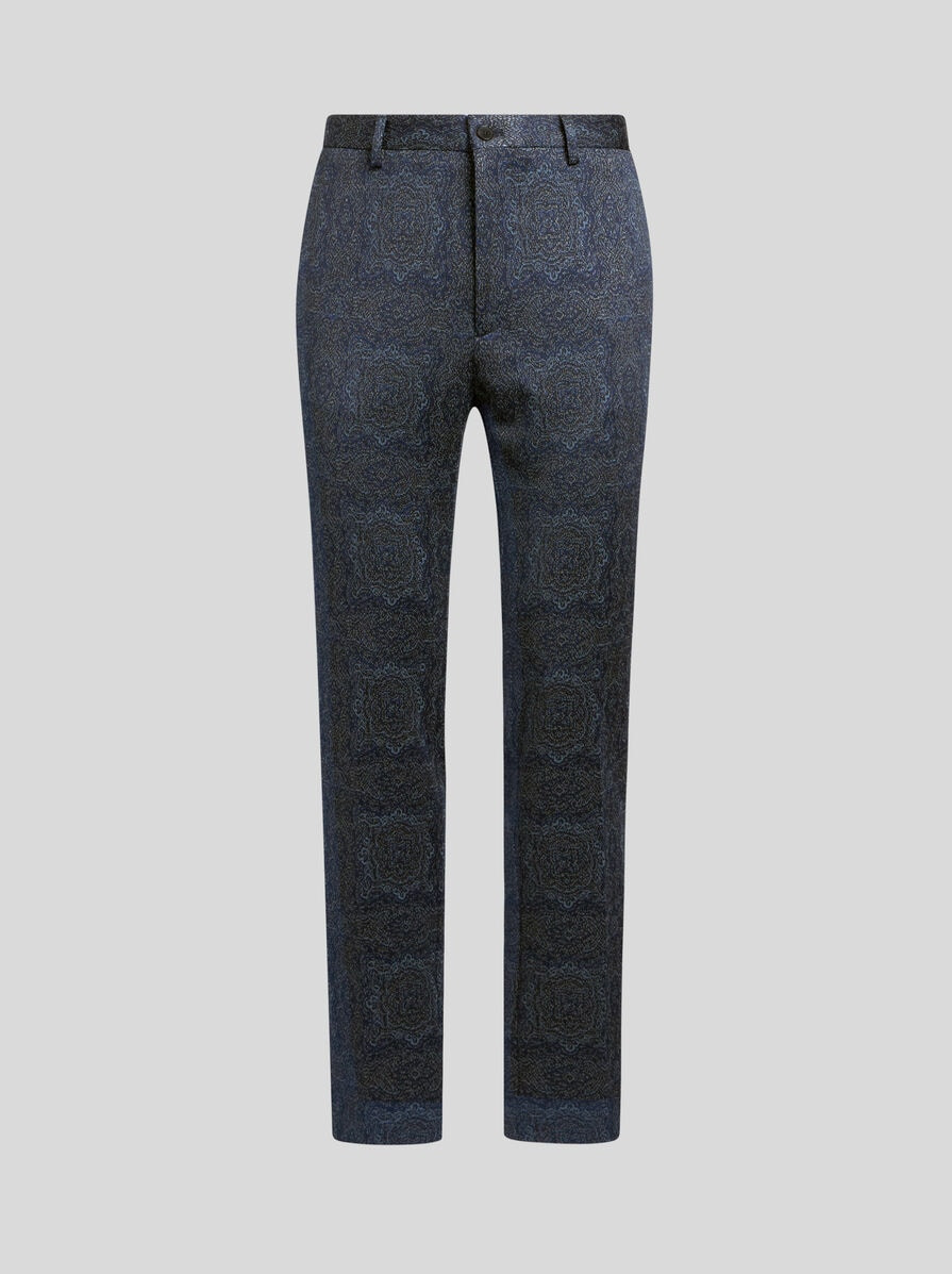 Tailored trousers in cotton-blend jersey. These feature an abstract jacquard motif and a rear label with the ETRO logo. • Roma regular fit • Rear welt pockets • Concealed zip and button closure • Made in Italy • The model is 6' 1½" (187 cm) tall and wears a size 48 PRODUCT DETAILS • 58% polyester, 20% cotton, 18% viscose, 3% polyamide, 1% elastane