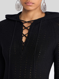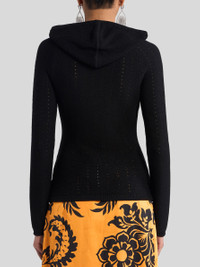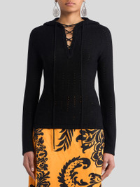 Long-sleeved top with hood and V-neck with crossover ribbon detail. This knit silk-blend garment features a distinctive vertical punched pattern. The item was presented at the Spring-Summer 25 Women's Runway Show. • Slim fit • Hood • V-neck with crossover ribbon detail • Long sleeves • Made in Italy • The model is 5' 9½" (177 cm) tall and wears a size S PRODUCT DETAILS • 76% silk, 24% polyamide